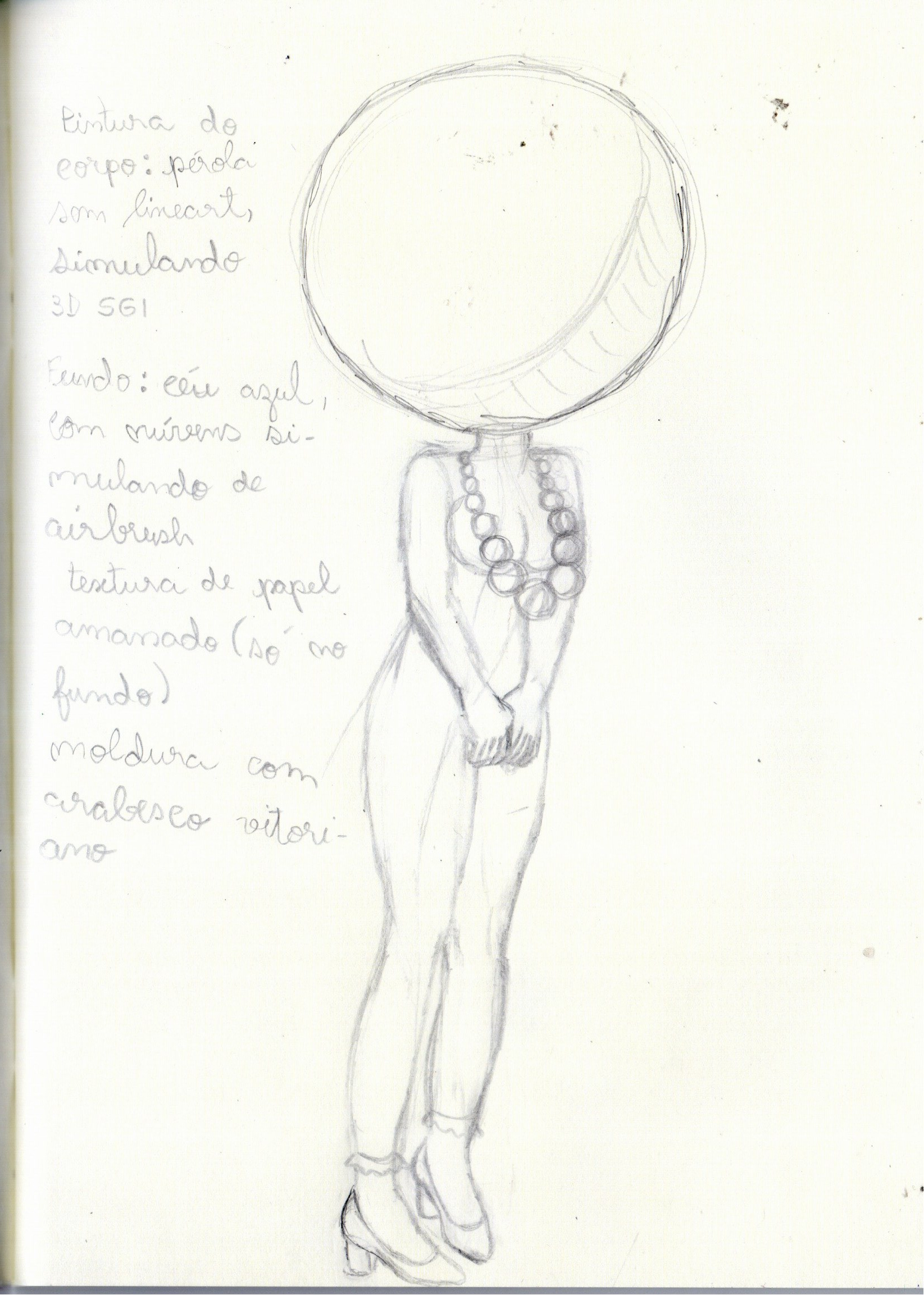 Esta estética específica pega referência do período vitoriano, mistura com Art Nouveau e dá uma viajada (literalmente esta estética fala muito sobre viagens por mar e aéreas, não é raro ver mapas, embarcações, nuvens e balões nessas obras). Além de desenhar uma pessoa com uma pérola gigante no lugar da cabeça, esta estética me inspirou ao plano de adicionar arabescos e texturas de papel ao desenho, como pode-se ver nas anotações do esboço.