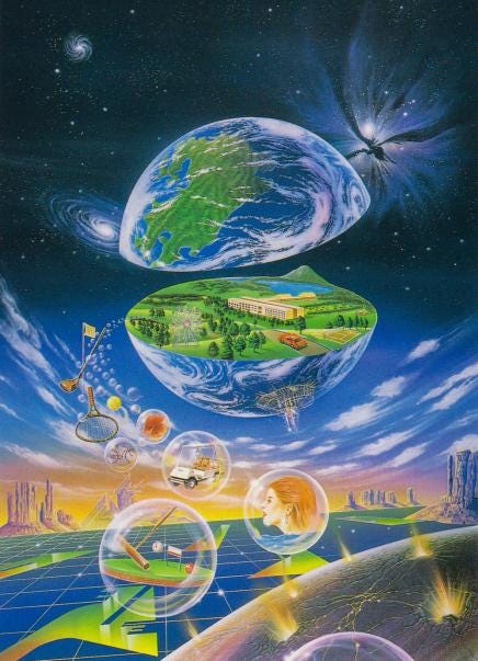 Outra estética que me inspirou a fazer o cabeção de pérola foi a Silicon Dreams, que remete às primeiras modelagens e animações 3D (CGI) lá dos anos 90. Esta estética usa bastante da forma esférica pra criar composições com profundidade tridimensional, além de surreais. Foi esta estética que me fez decidir que este desenho seria finalizado digitalmente, pois só na pintura digital eu conseguiria chegar ao menos perto de emular essa “textura” 3D.